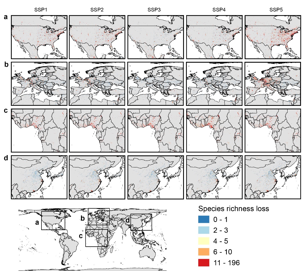 未来共享社会经济路径(SSP)下城市扩张导致的生物多样性潜在丧失