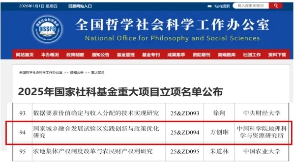 由方创琳研究员带领团队鲍超研究员、马海涛研究员、孙思奥研究员、王振波研究员申报的国家社会科学基金重大项目“国家城乡融合发展试验区实践创新政策优化研究”获批立项,项目编号为25&ZD094。这是方创琳研究员带领团队第2次成功申请到的国家社会科学基金重大项目,第1次成功申报的国家社会科学基金重大项目“中国城市发展空间格局优化理论与方法”是在2013年,并于2015年提前结题免检,当年成功入选国家哲学社会科学优秀成果文库,获国家哲学社会科学优秀成果最高奖(文库奖)。