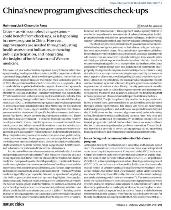 Liu Haimeng,Fang Chuanglin*. China’s new program gives cities check-ups. Nature Cities,2025,2,910–912. https://doi.org/10.1038/s44284-025-00317-8.