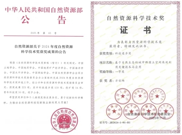 由方创琳研究员带领中国科学院地理科学与资源研究所团队鲍超研究员、杜云艳研究员、李广东研究员、马海涛研究员、王振波研究员、孙思奥研究员,联合自然资源部国土空间规划研究中心张晓玲研究员、中国城市规划设计研究院张兵教授级城市规划师、中国国土勘测规划院田志强研究员等单位专家共同完成的“基于自然生态的城市群国土空间高效利用关键技术与应用”获得2024年度自然资源科学技术奖一等奖。见自然资源部官方公告《自然资源部关于2024年度自然资源科学技术奖获奖成果的公告》(2025年第65号,2025年11月14日)。