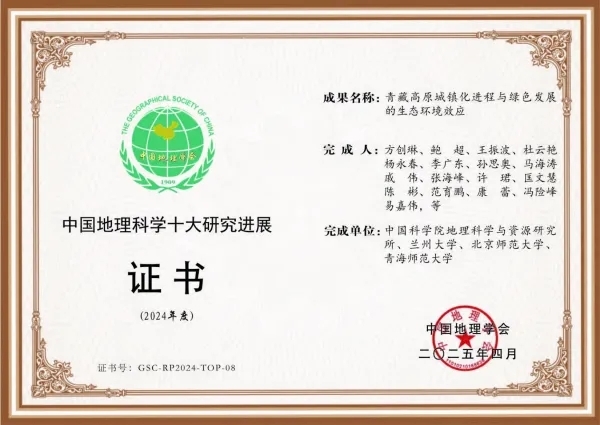 由方创琳研究员牵头,鲍超、王振波、杜云艳、杨永春、李广东、孙思奥、马海涛、戚伟、张海峰、许珺、匡文慧、陈彬、范育鹏、康蕾、冯险峰、易嘉伟等共同合作完成的“青藏高原城镇化进程与绿色发展的生态环境效应”成果获得2024年度中国地理科学十大研究进展。本成果在科技部第二次青藏高原综合科学考察项目和中国科学院先导专项课题资助下,系统解析了青藏高原城镇化的特殊性与时空演变分异规律,定量测度了青藏高原城镇化对生态环境的影响,采用多模型算法计算了基于资源与生态环境约束的青藏高原城镇化承载阈值约2620万人,提出了捍卫国家安全屏障的青藏高原“梳状”固边型城镇体系建设方案,为协调地球第三极城镇化与生态环境关系、保护亚洲水塔及绿色发展提供了重要科技支撑。出版《青藏高原城镇化绿色发展地图集》(中国地图出版社,2024)、《青藏高原城镇化进程与绿色发展》(科学出版社,2024)、《青藏高原城镇化及生态环境效应》(科学出版社,2023)、《青藏高原人类活动的数字足迹及挖掘》(科学出版社、2023)等专著。