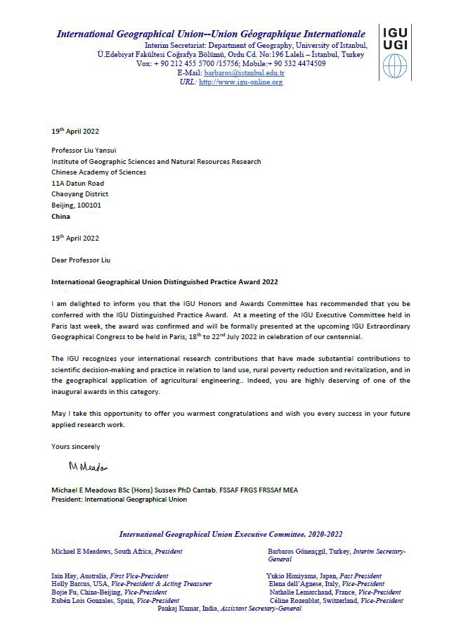 国际地理联合会(IGU)通知,中国科学院地理科学与资源研究所刘彦随研究员荣获2022年国际地理联合会杰出地理实践奖(The IGU Award for Distinguished Geographical Practice)。该奖是为表彰哪些学术成果被广泛采纳和应用于学术界内外各个领域实践,并做出杰出贡献的地理学家而设立的国际奖项。该奖为庆祝2022年IGU成立百年而首次设立,并将于7月18-22日在法国巴黎召开的“国际地理联盟100周年大会”上公布名单并颁发奖项。