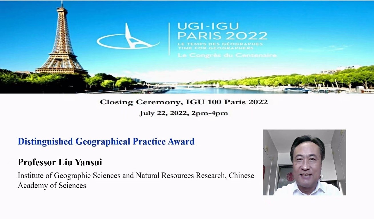 2022年7月18-22日,国际地理联合会(IGU)百年庆典特别大会在法国巴黎隆重召开。来自100个国家与地区的2500余名学者以线下线上的形式参加了会议,其中现场参加的学者为2200余名。在巴黎当地时间7月22日下午大会举行了2022年IGU奖项颁奖仪式。颁奖仪式由IGU主席Michael Meadows院士主持,IGU前主席、现荣誉与奖励委员会主席Ronald F. Abler教授发布了获奖人和授奖理由,Michael Meadows 院士颁发奖牌证书。刘彦随研究员荣获国际地理联合会(IGU)杰出地理实践奖,IGU给出的授奖理由是“在土地利用、乡村扶贫与乡村振兴的科学决策和实践,以及农业地理工程应用领域做出了杰出贡献,为地理知识和技能在成功解决重大的环境与社会问题方面提供了许多优秀的案例”。