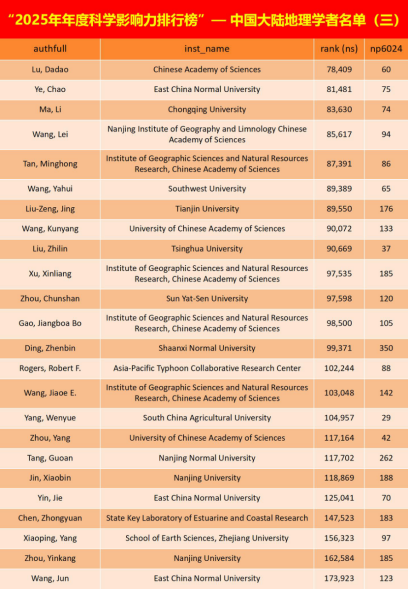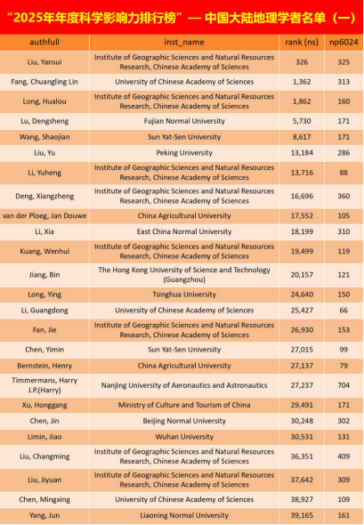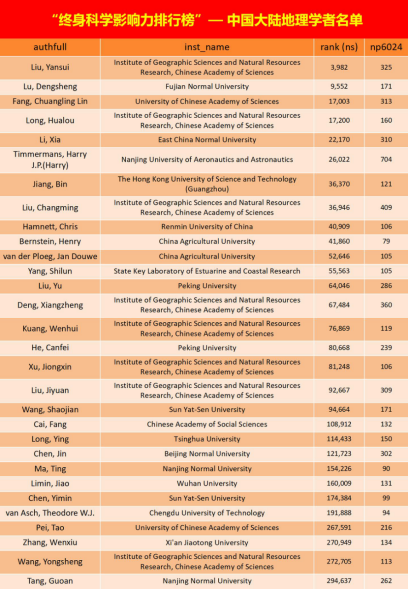 中国地理学者入选榜单情况(rank(ns)指基于综合分数的全球排名,np6024指1960-2024年论文总数)